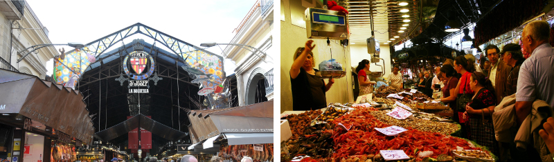 途中で、スペインを代表する建築家ガウディの作品の、グエル邸を見ることができます。さらに進むと、100年以上の歴史のある公設マーケット、サン・ジョゼップ市場があります。